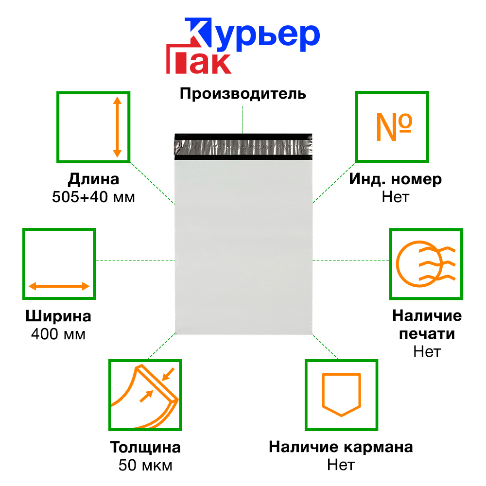 Курьер-пакет белый без печати, без кармана, 400*505+40 мм, 50 мкм, 1 шт.