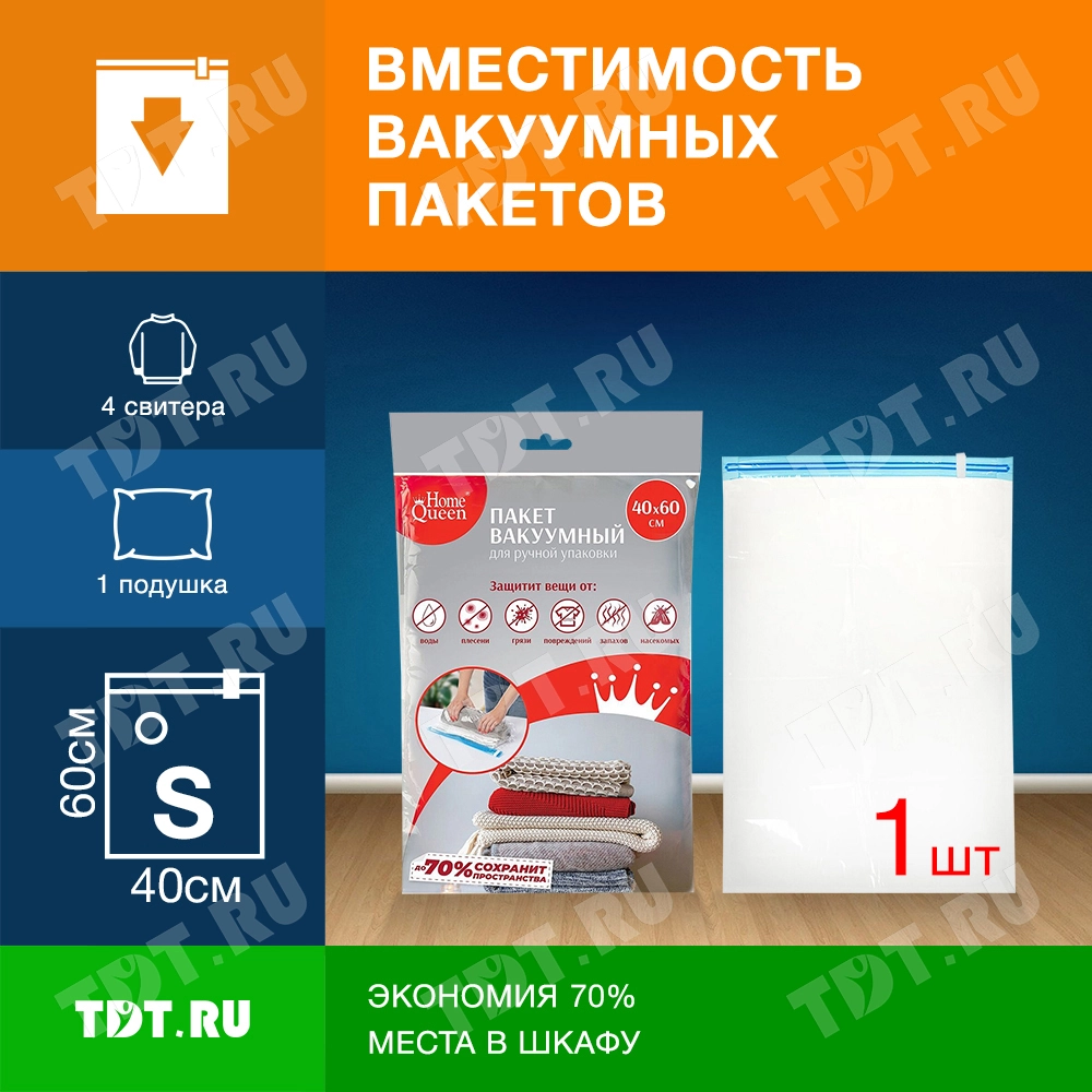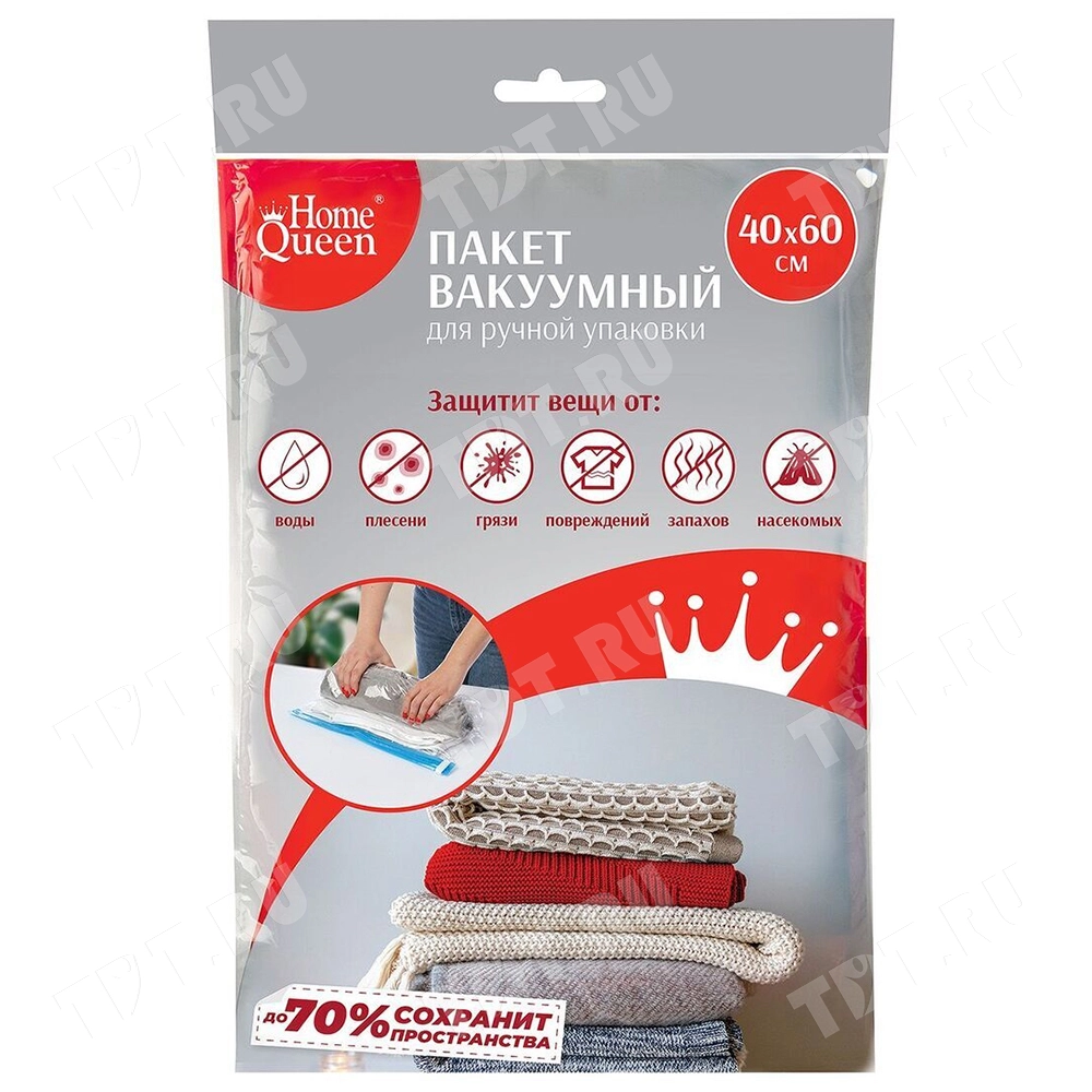 Вакуумный пакет Home Queen для компактного хранения вещей, прозрачного цвета, длиной 60 см, шириной 40 см, толщиной 50 мкм, в упаковке по 1 штуке. Конструкция пакета предусматривает ручной способ использования. Производится в Китае.