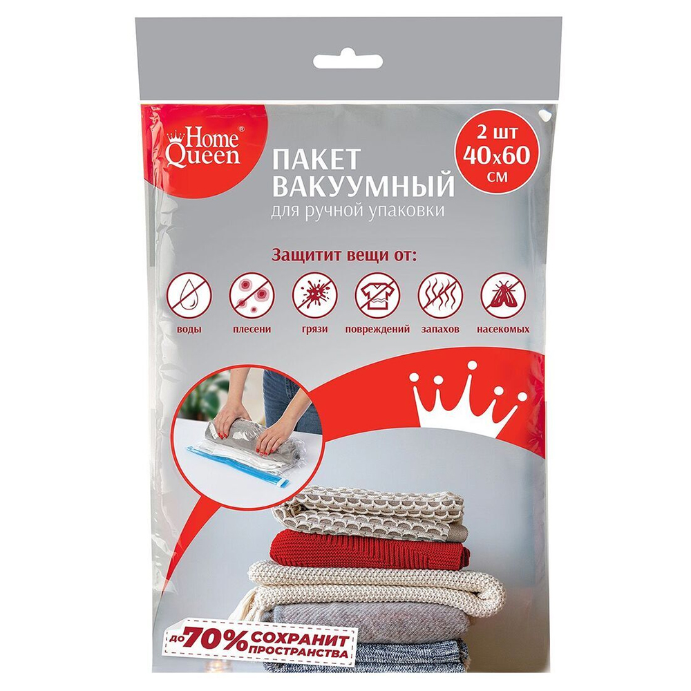 Вакуумный пакет Home Queen для компактного хранения вещей, прозрачного цвета, длиной 60 см, шириной 40 см, толщиной 50 мкм, в упаковке по 2 штуки. Конструкция пакета предусматривает ручной способ использования. Производится в Китае.