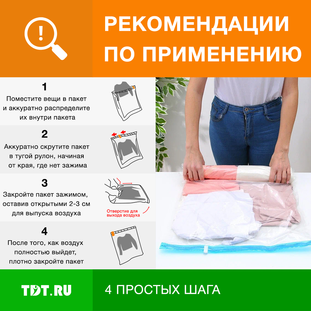 Область применения:Вакуумный пакет — идеальное решение для компактного хранения вещей: сезонные вещи в межсезонье, редко используемые комплекты постельного белья. И даже компактная перевозка вещей во время путешествия. Прозрачный пакет позволит быстро определить содержимое пакета. Также он помогает защищать вещи от влаги и плесени, выцветания, пыли, запаха и насекомых.