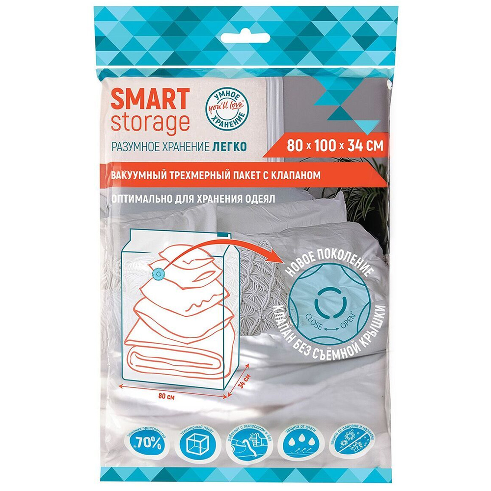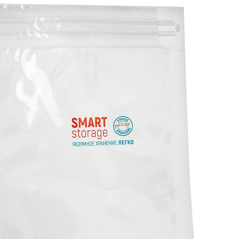 Вакуумный трёхмерный пакет Smart Storage от You'll love для компактного хранения объёмных вещей, прозрачного цвета с печатью логотипа, длиной 100 см, шириной 80 см, глубиной 34 см, толщиной 60 мкм, в упаковке по 1 штуке. Клапан последнего поколения для удаления воздуха пылесосом. Производится в Китае.