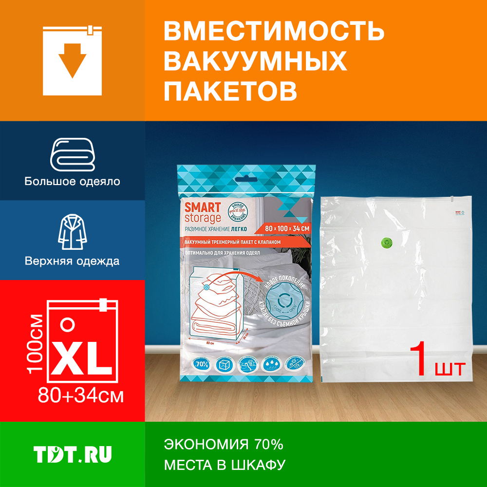 Вакуумный трехмерный пакет Smart Storage с клапаном, 80*100*34 см, 1 шт.