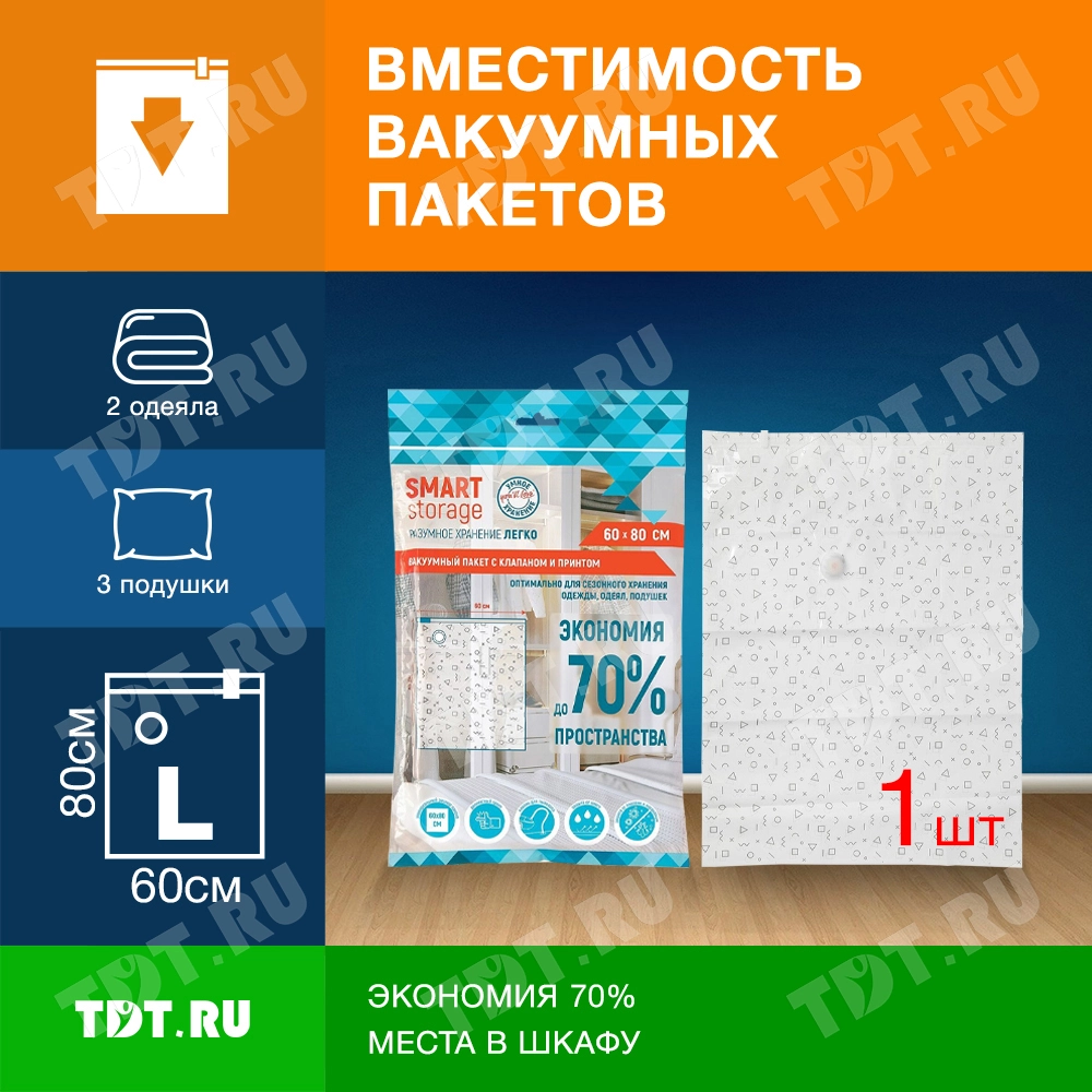 Вакуумный пакет Smart Storage для компактного хранения вещей, прозрачного цвета с интересным принтом, длиной 80 см, шириной 60 см, толщиной 65 мкм, в упаковке по 1 штуке. Клапан последнего поколения для удаления воздуха пылесосом. Производится в Китае.
