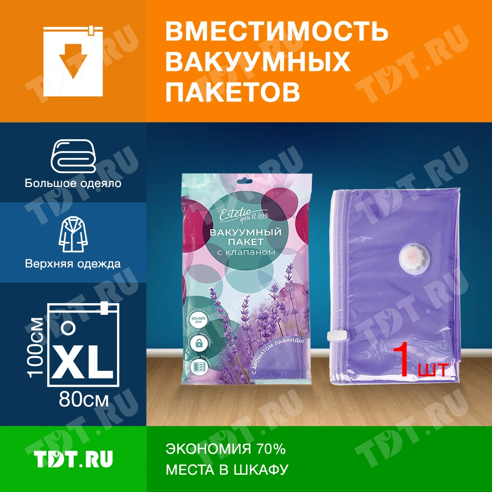 Вакуумный пакет You'll love Estetic с ароматом лаванды для компактного хранения вещей, фиолетового цвета, длиной 100 см, шириной 80 см, толщиной 65 мкм, в упаковке по 1 штуке. Клапан последнего поколения для удаления воздуха пылесосом. Производится в Китае.