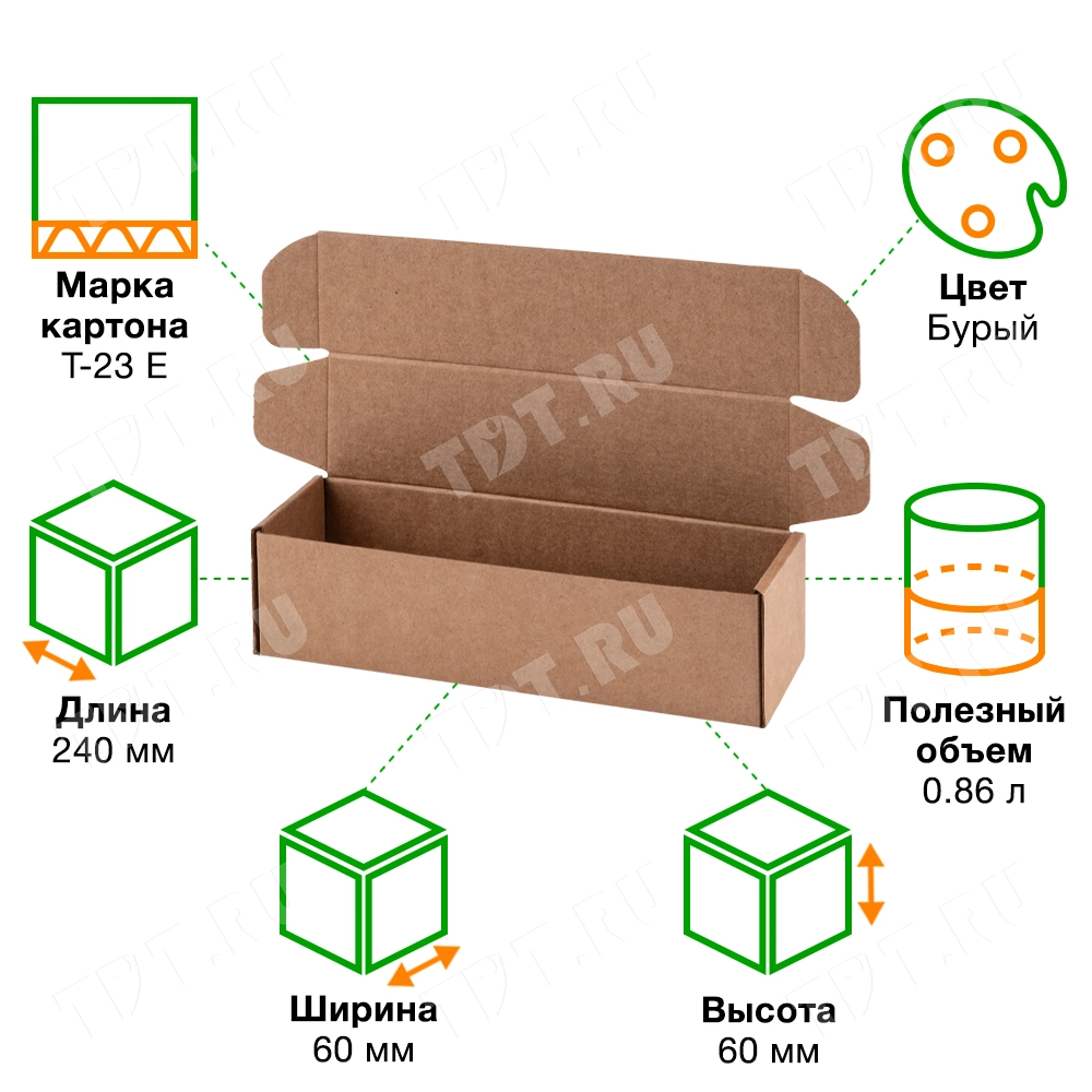 Короб «Тубус» бурый, длиной 240 мм, шириной 60 мм и высотой 60 мм. Изготовлен из трёхслойного картона Т-23 Е. Полезный объём — 0.86 л.