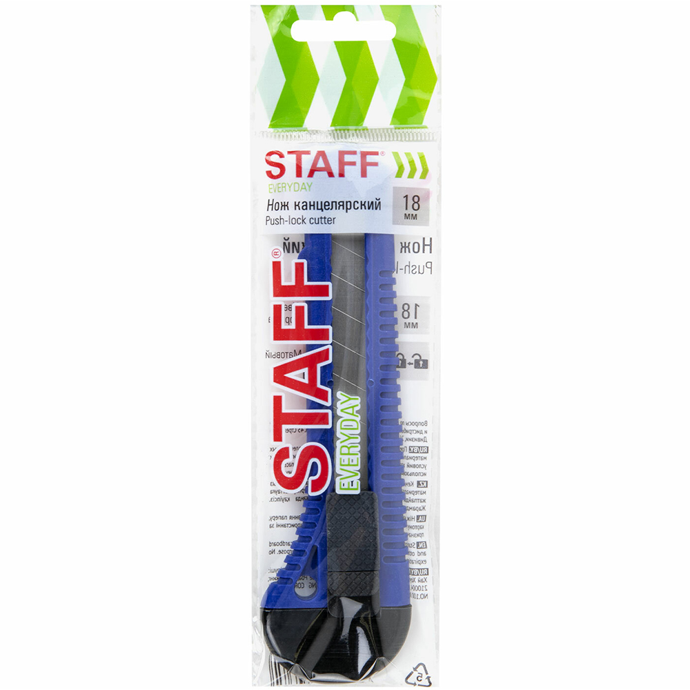 Нож канцелярский STAFF «EVERYDAY» с отламываемым лезвием, код производителя 238179, Push-lock cutter, шириной 18 мм. Материал – пластик. Производится в Китае.