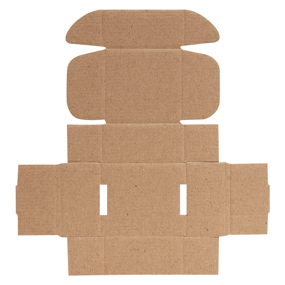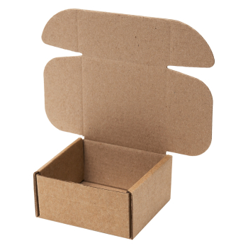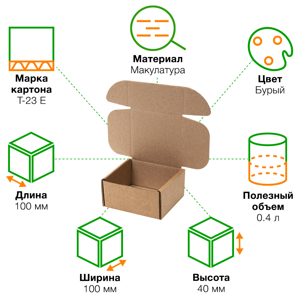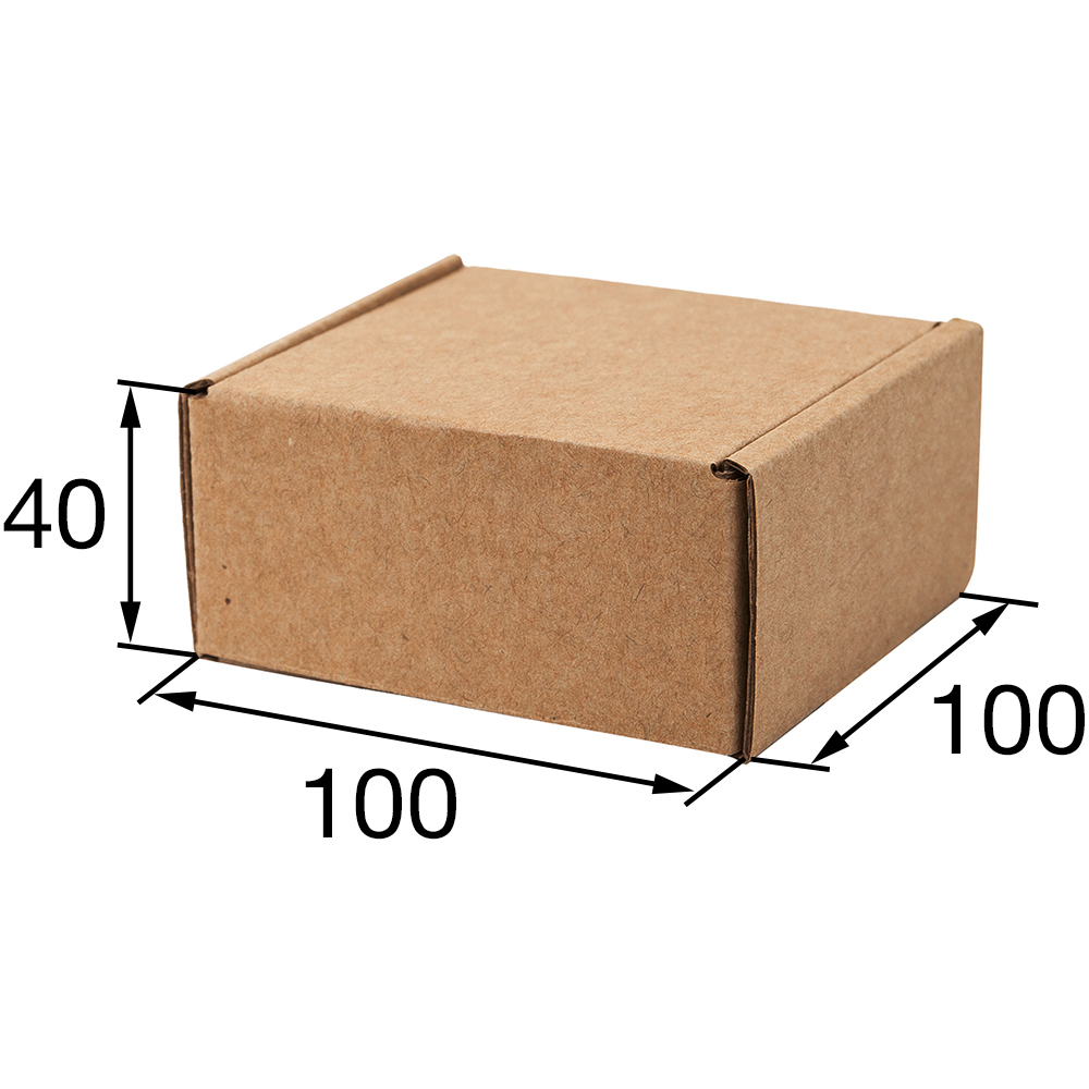 Самосборный короб №84, бурый, длиной 100 мм, шириной 100 мм и высотой 40 мм. Изготовлен из микрогофрокартона Т-23 Е. Полезный объём — 0.4л.