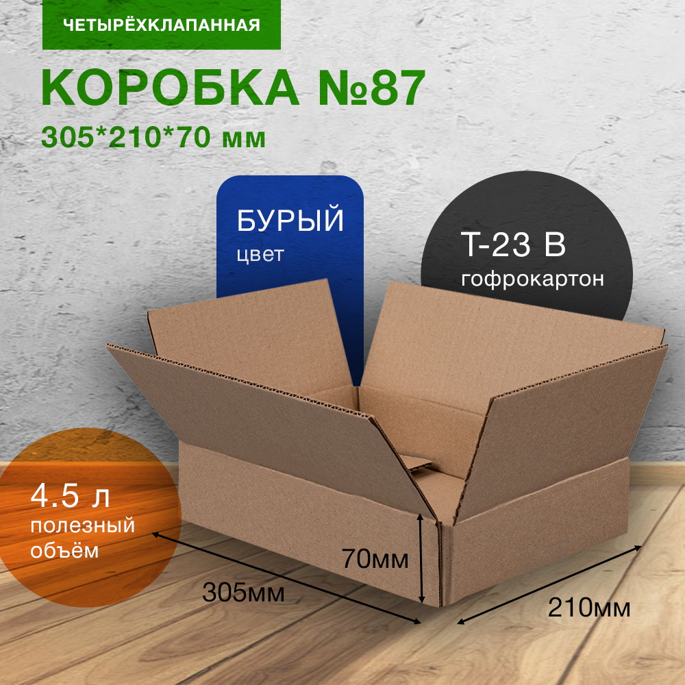 Коробка №87 бурого цвета, длиной 305 мм, шириной 210 мм и высотой 70 мм. Изготовлен из трехслойного картона марки Т-23 В. Полезный объём — 4.5 л.