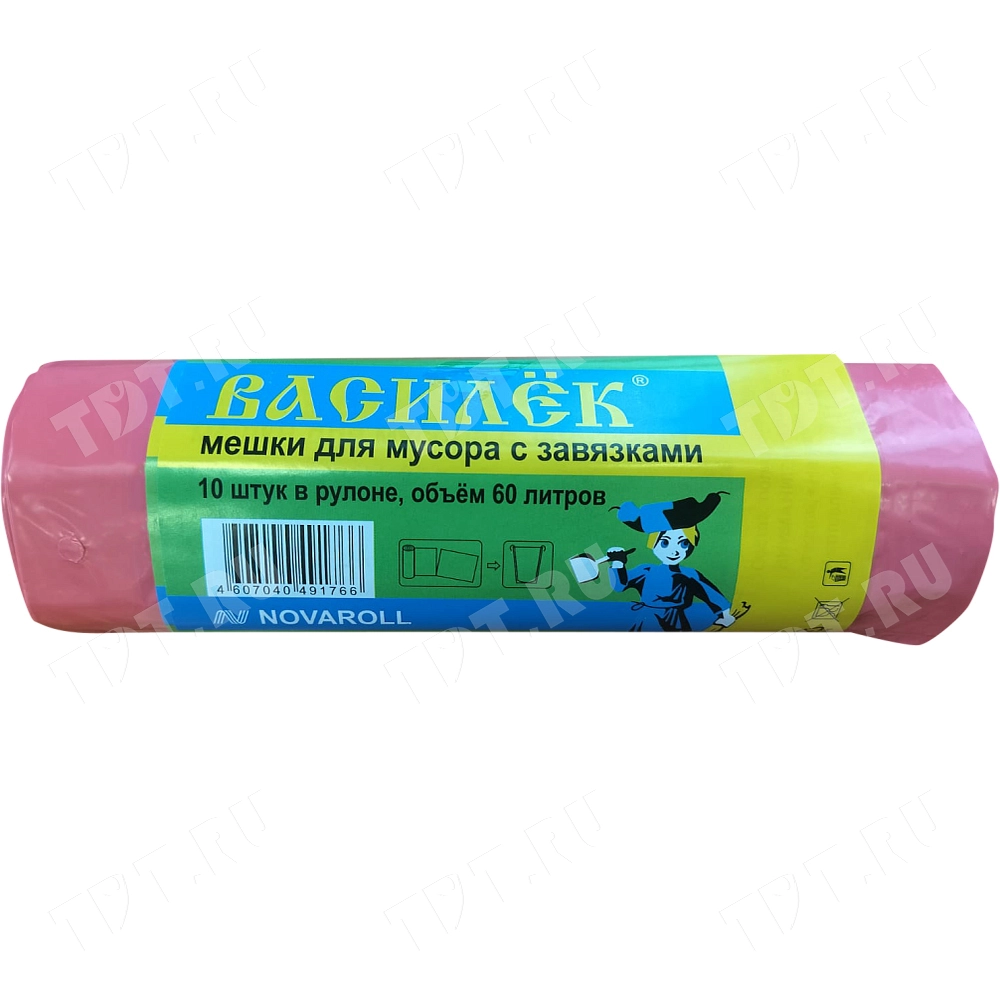 Мешки для мусора «Василёк» с завязками, красного цвета снаружи и белого внутри, объёмом 60 л, длиной 70 см, шириной 60 см, толщиной 25 мкм, в упаковке по 10 штук. Изготовлены из полиэтилена высокого давления (ПВД).