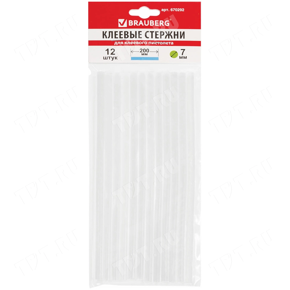 Стержни Brauberg для клеевых пистолетов горячего плавления, прозрачного цвета, длиной 200 мм, диаметром 7 мм, в упаковке по 12 штук. Производятся в Китае.