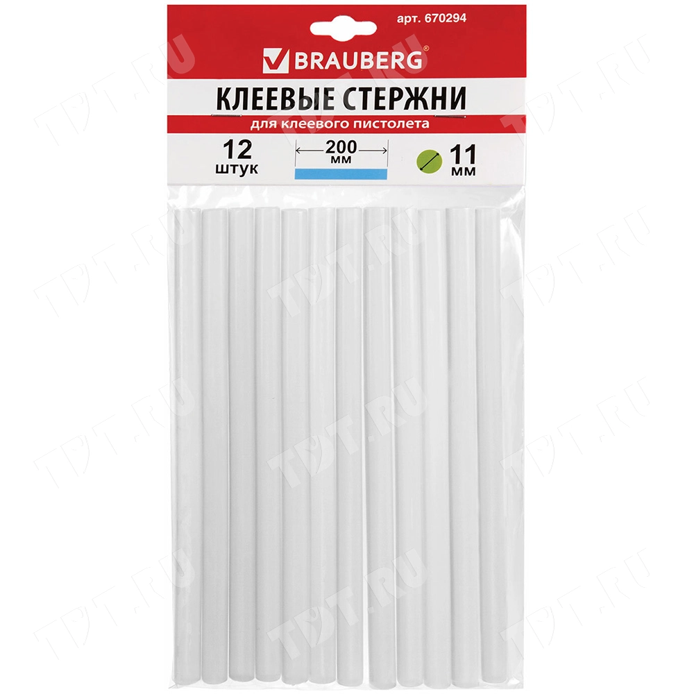 Стержни Brauberg для клеевых пистолетов горячего плавления, прозрачного цвета, длиной 200 мм, диаметром 11 мм, в упаковке по 12 штук. Производятся в Китае.