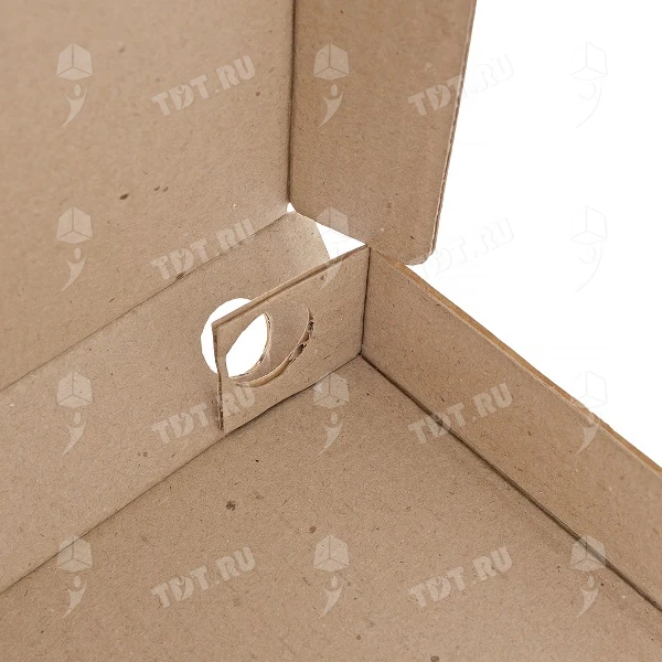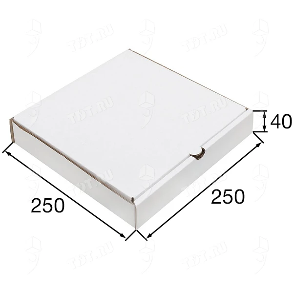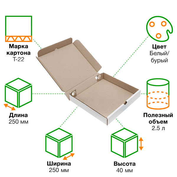 Беленая коробка для пиццы, длиной 250 мм, шириной 250 мм и высотой 40 мм, 50 штук. Изготовлена из трехслойного картона марки Т-22. Полезный объём — 2.5 л. Производится в России.