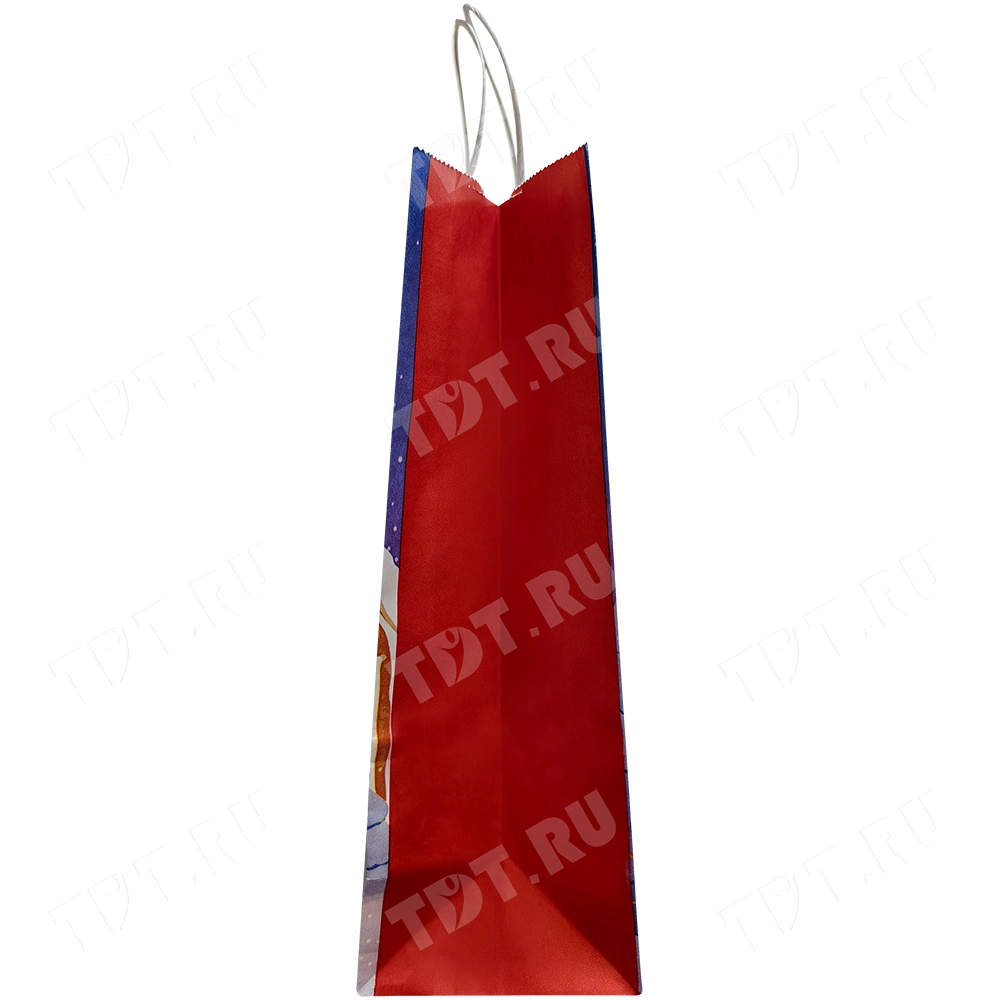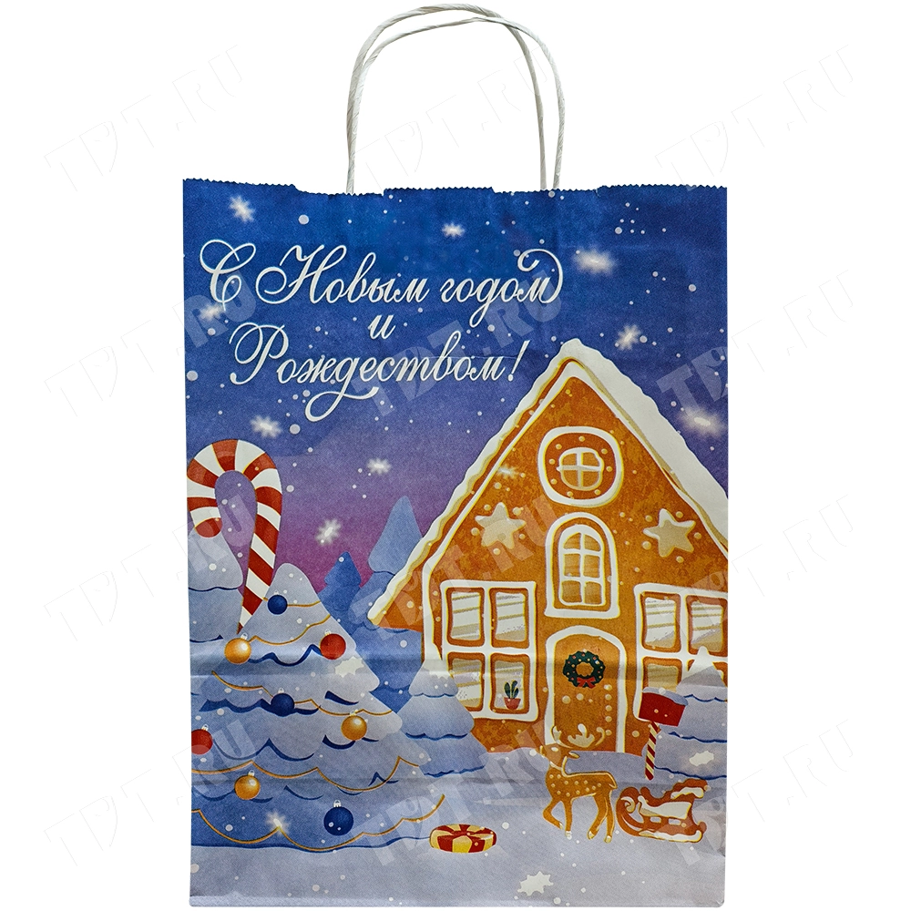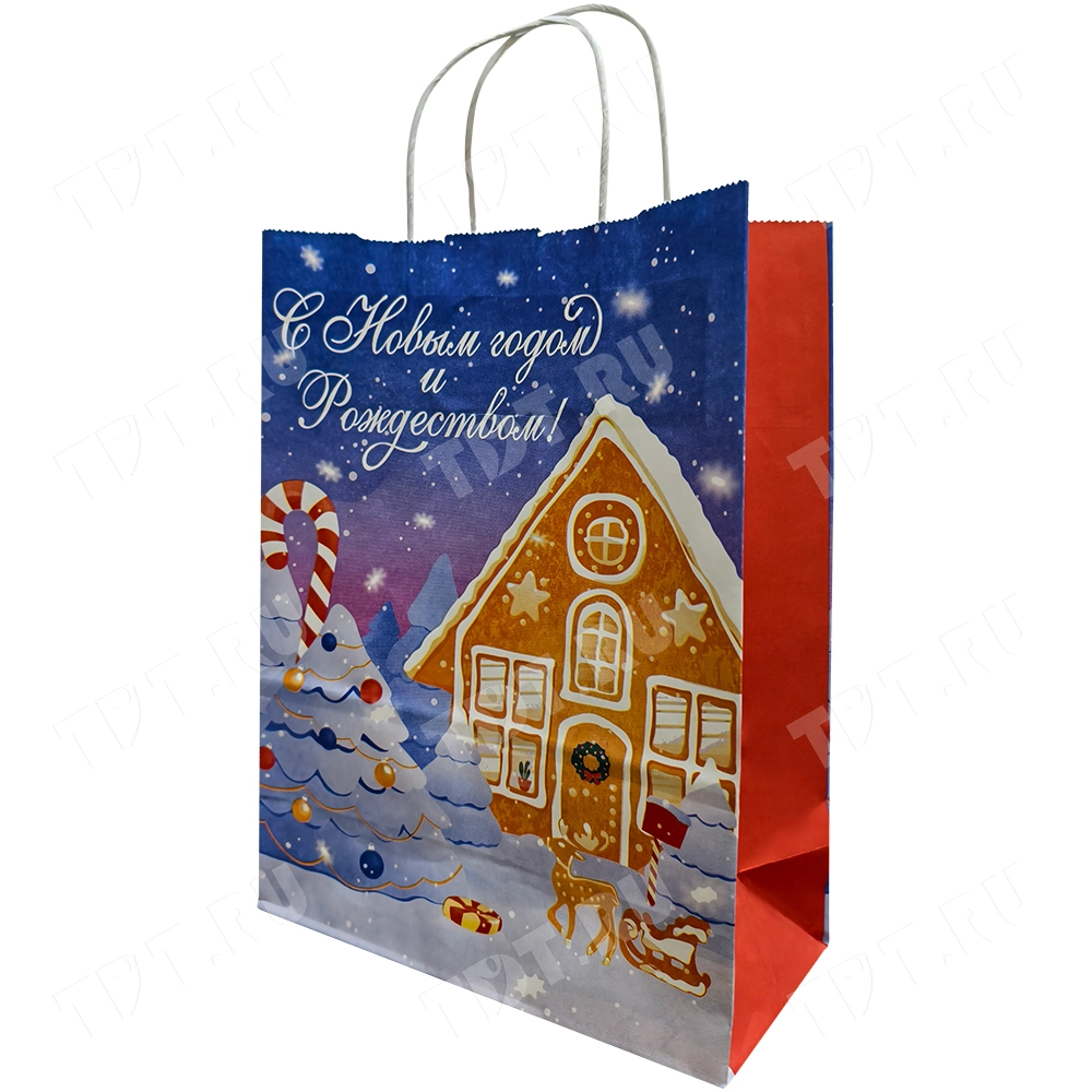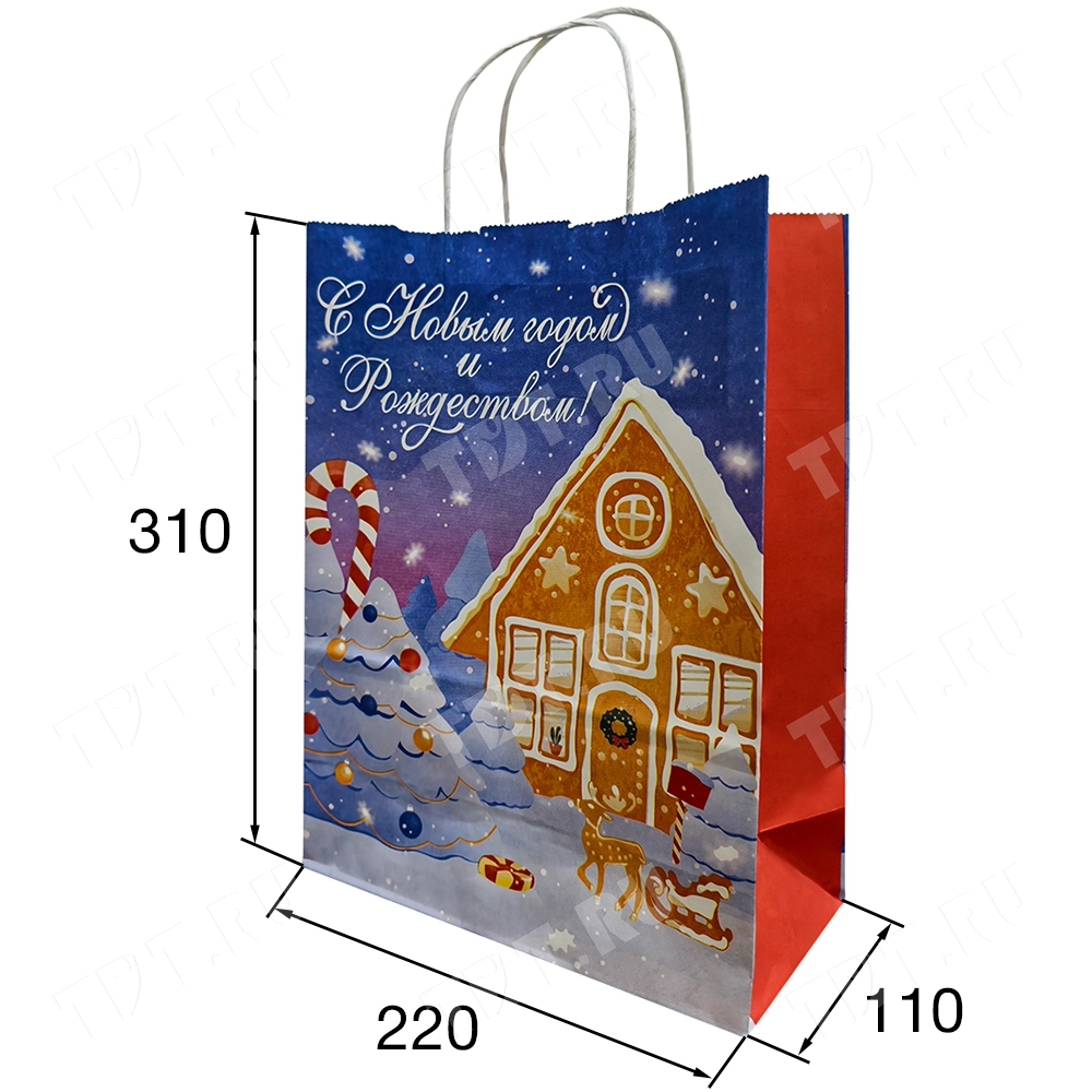 Бумажный подарочный пакет с крученой ручкой и новогодним рисунком «С Новым годом и Рождеством!» длиной 220 мм, шириной 110 мм, высотой 310 мм изготовлен из бумаги плотностью 100 г/м². Пакеты производятся в России.