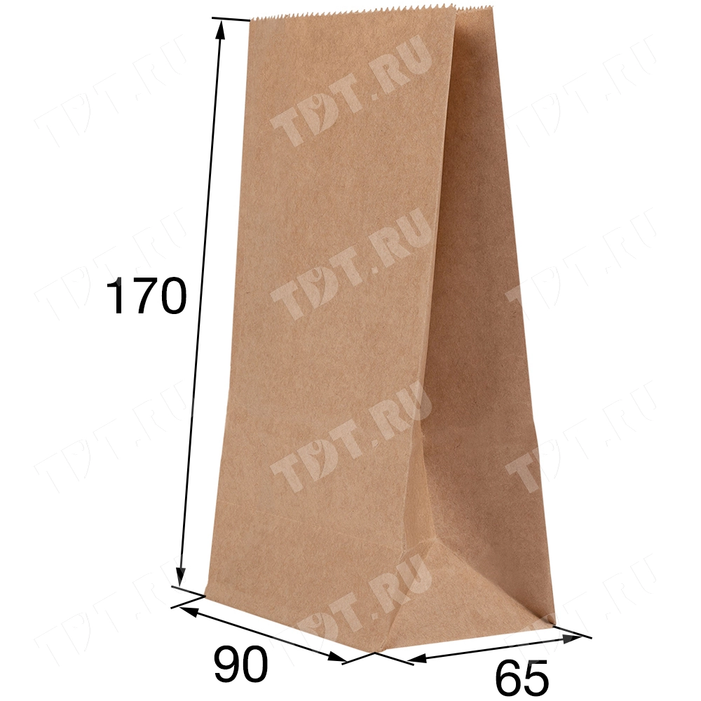 Бумажный крафт пакет без ручек длиной 90 мм, шириной 65 мм, высотой 170 мм изготовлен из экологичного материала. Пакеты производятся в России.