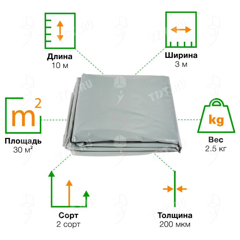 Серая полупрозрачная пленка ПВД (2 сорта) в рукаве, толщиной 200 мкм, шириной 1,5 м, длиной 10 м, при развороте и разрезе общий размер составит 3м*10м. Пленка производится в России.