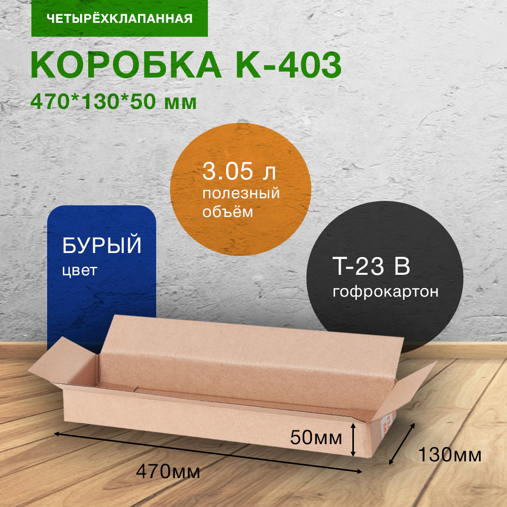 Короб К-403 бурого цвета, длиной 470 мм, шириной 130 мм и высотой 50 мм. Изготовлен из трехслойного картона марки Т-23 В. Полезный объём — 3.05 л.