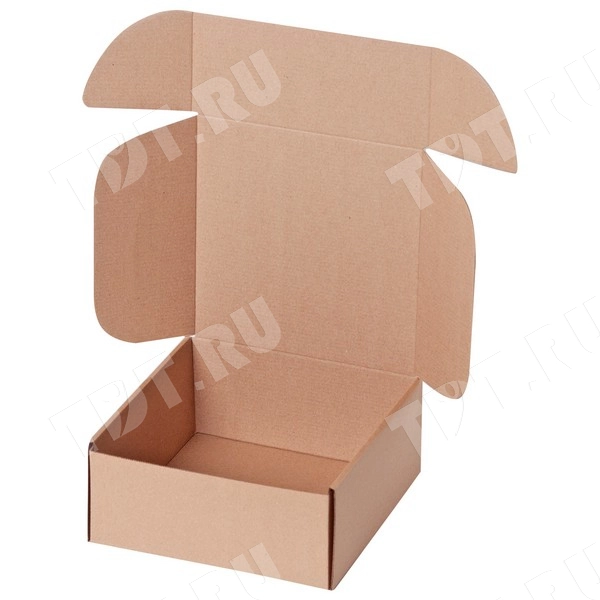 Короб КС-239 МГФ бурого цвета, длиной 205 мм, шириной 205 мм и высотой 95 мм. Изготовлен из микрогофрокартона Т-23 Е. Полезный объём — 3.99 л.