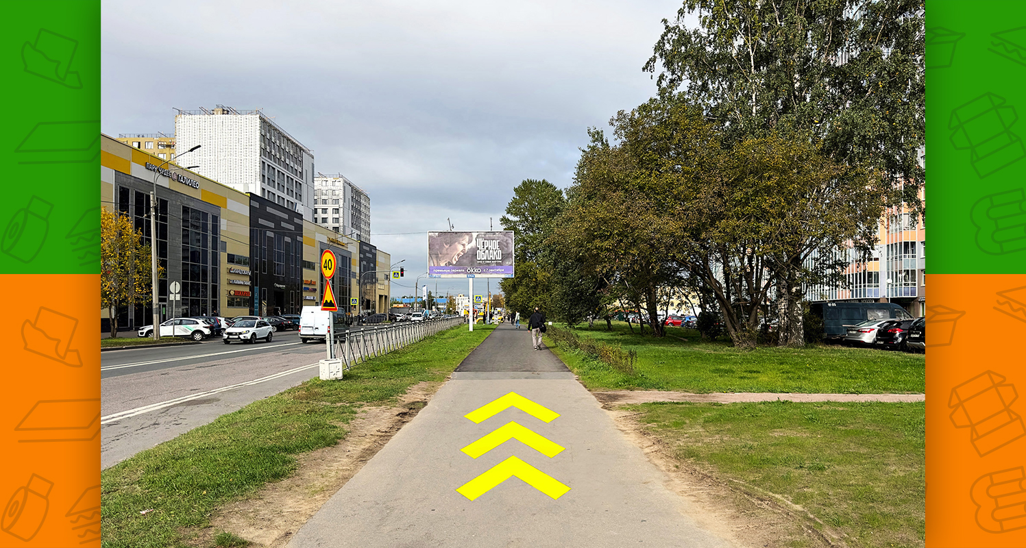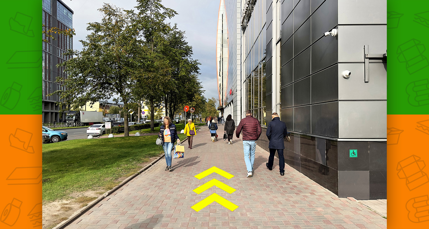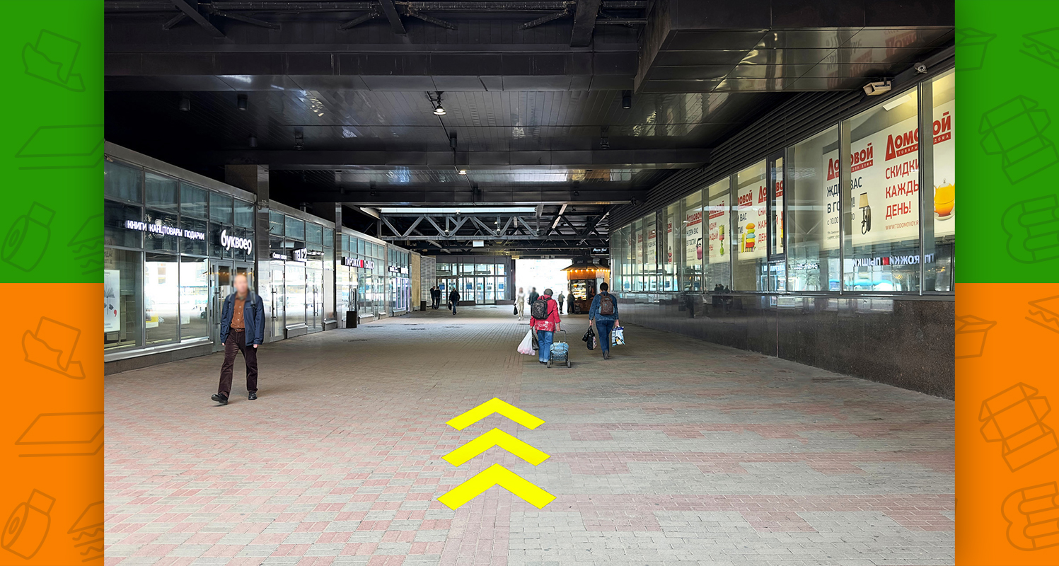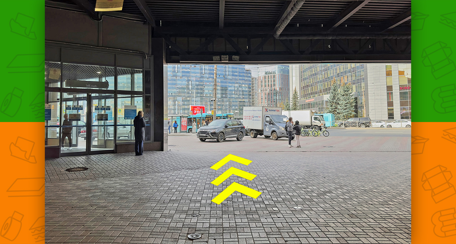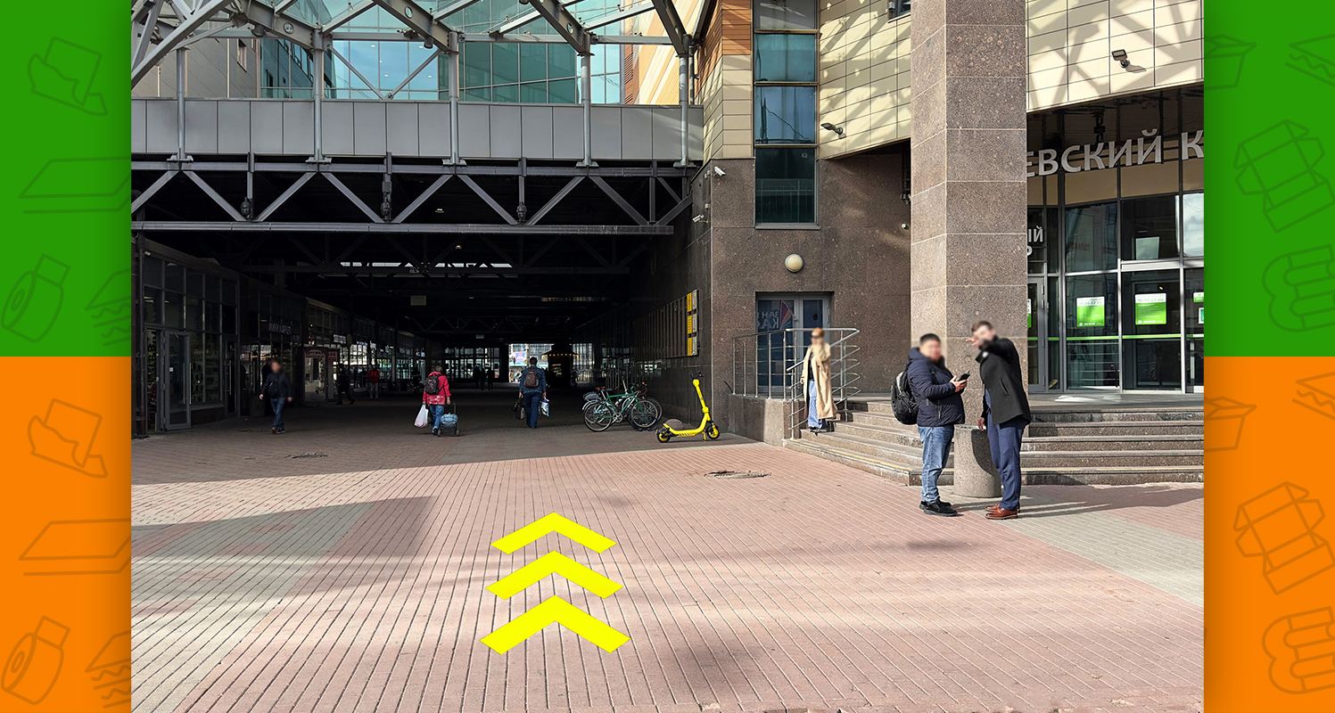 - после выхода из метро необходимо пройти под крытым переходом между двумя торговыми центрами и выйти к Заневскому проспекту