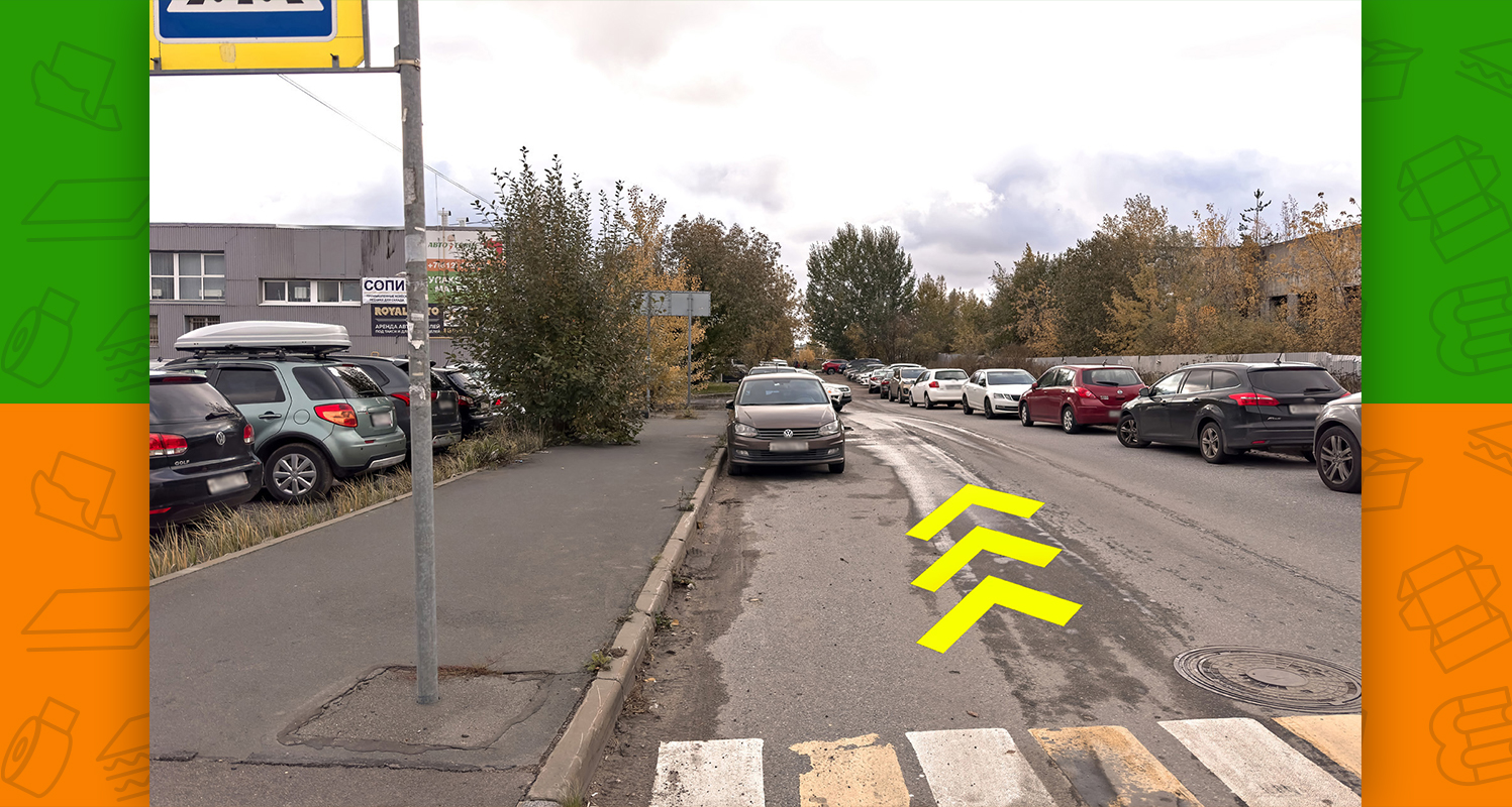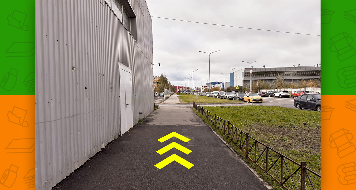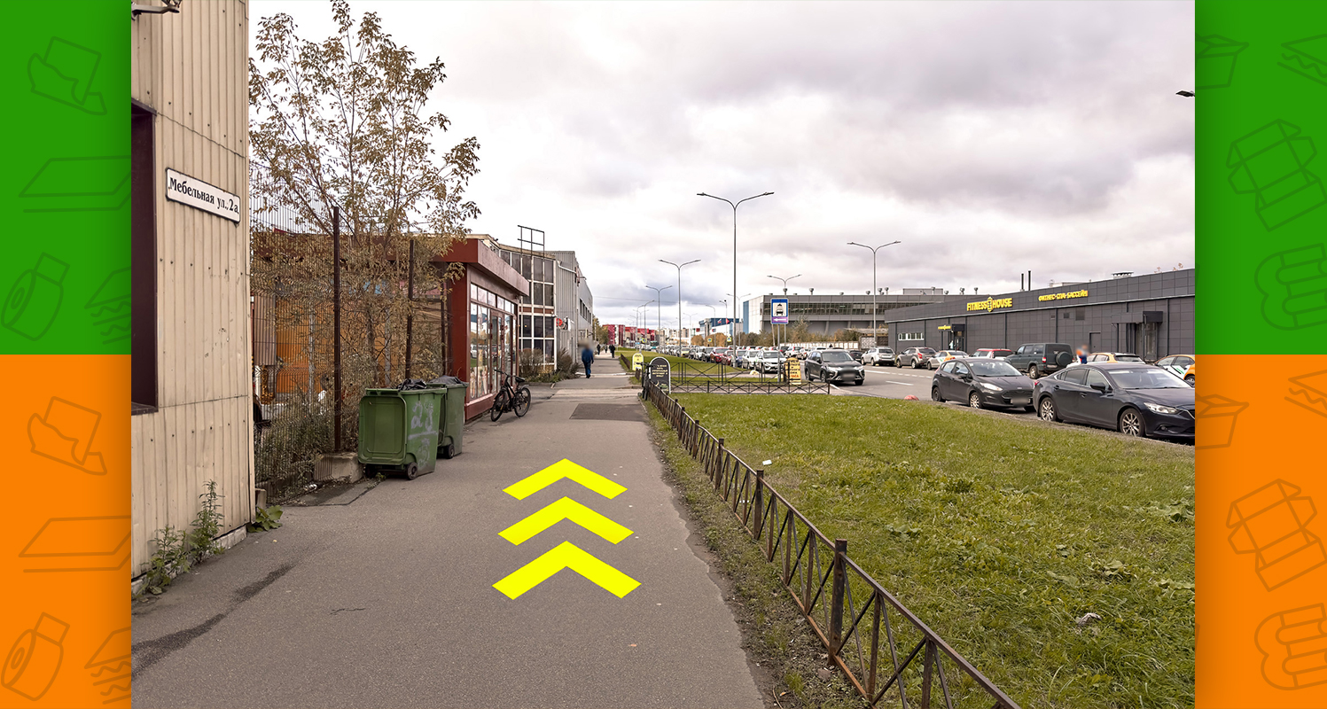 - по Мебельной улице пройти 350 метров по левой стороне, мимо зданий: